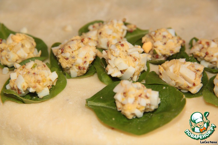 Наша начинка: свежий шпинат, сыр, яйца, которые остались после Пасхи, горчица и чеснок.