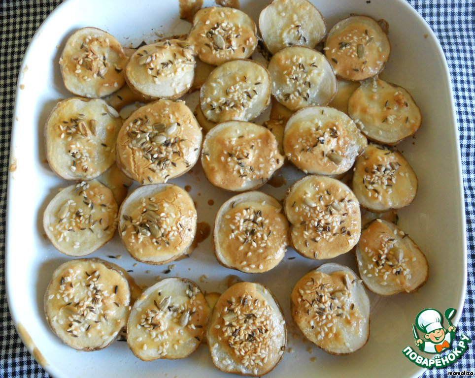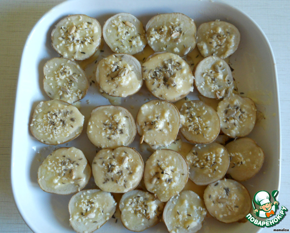 Измельчить сыр, смешать с яйцом и покрыть смесью запеченный картофель. Сверху посыпать семенами кунжута, подсолнечника и тмином.