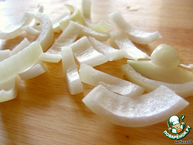 В это время поставить на огонь воду для макарон. Почистить половину луковицы и нарезать полукольцами. Я нарезала крупно, так как потом ее уберу. Обжарить до мягкости.