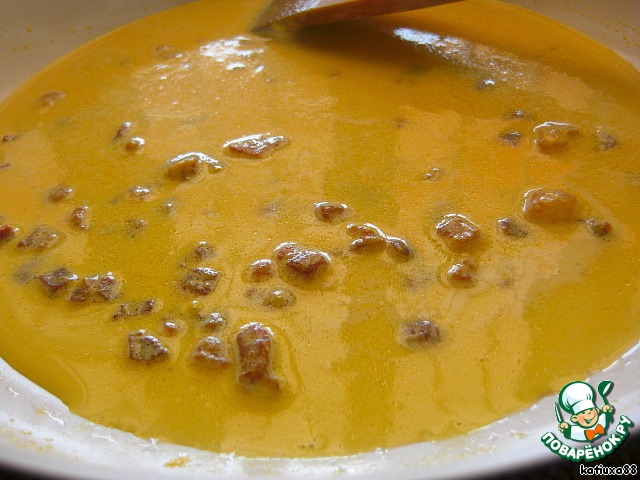 Шафран разбавить в 2-х ложках воды и смешать со сливками. Вылить смесь на сковороду и поставить на медленный огонь на 5 минут, изредка помешивая, пока немного не загустеет. После чего добавить ветчину.