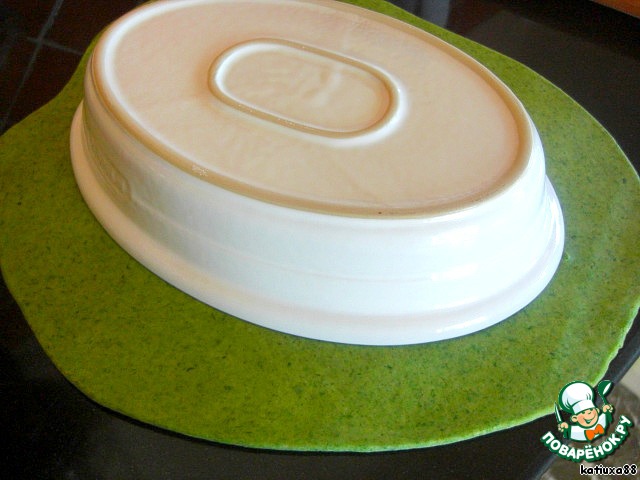 Достать тесто из холодильника, раскатать до толщины 0,5 см. Положить сверху форму и обрезать тесто, отступая на 1 см от края формы.