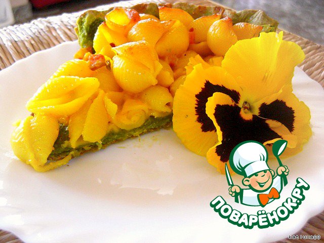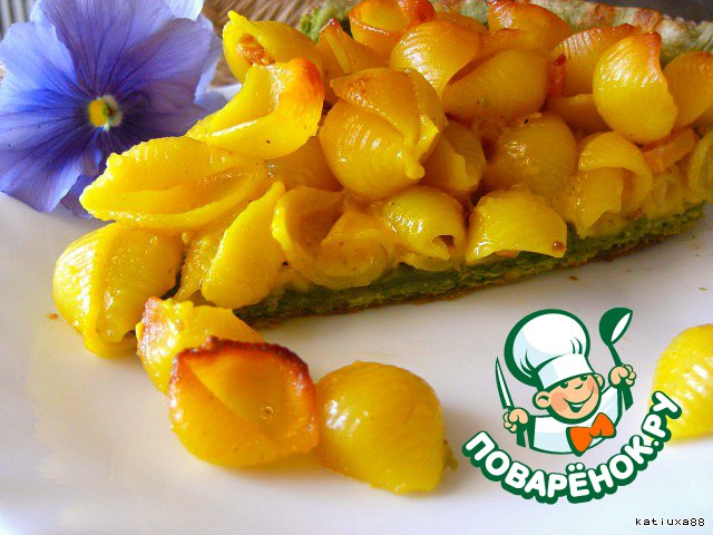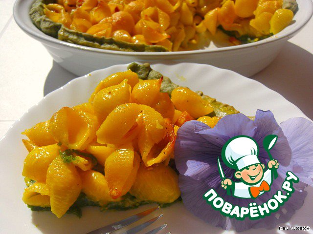 Тесто положить в смазанную маслом форму, сверху выложить макароны. Выпекать в предварительно разогретой духовке (210°) в течение 15 минут на самом низу и еще 10 минут, поставив в середину духовки. Вот что получается!!!