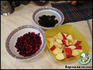 Замочите в горячей воде чернослив, очистите 2 яблока и нарежьте кубиками, разморозьте клюкву.