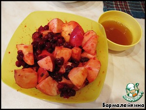 Добавьте в клюкву размокший чернослив и яблоки. Все хорошо перемешайте.