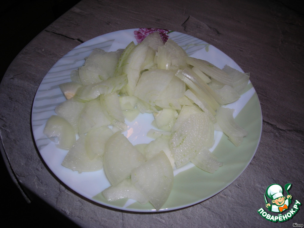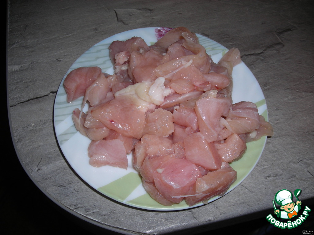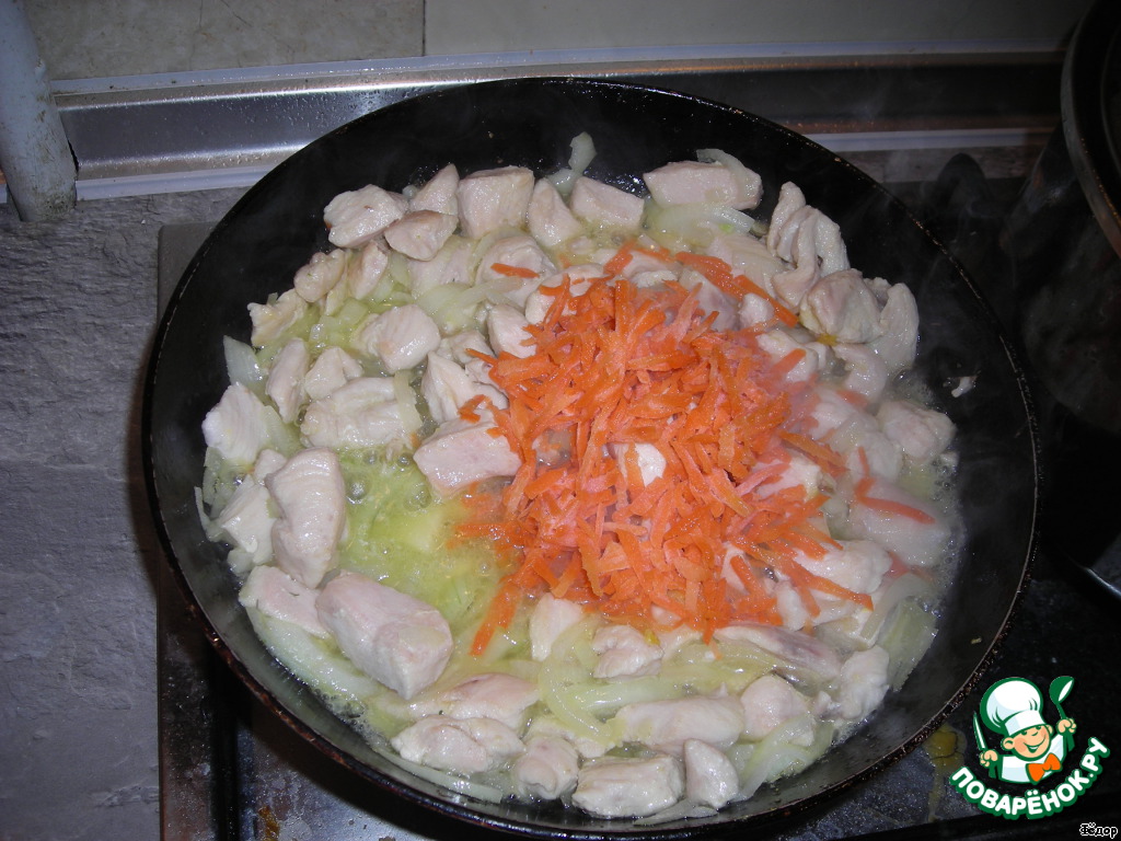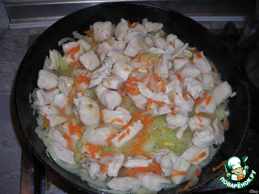 Как только мясо побелело, добавляем лук. Протушить минуты 1,5, время от времени помешивая.