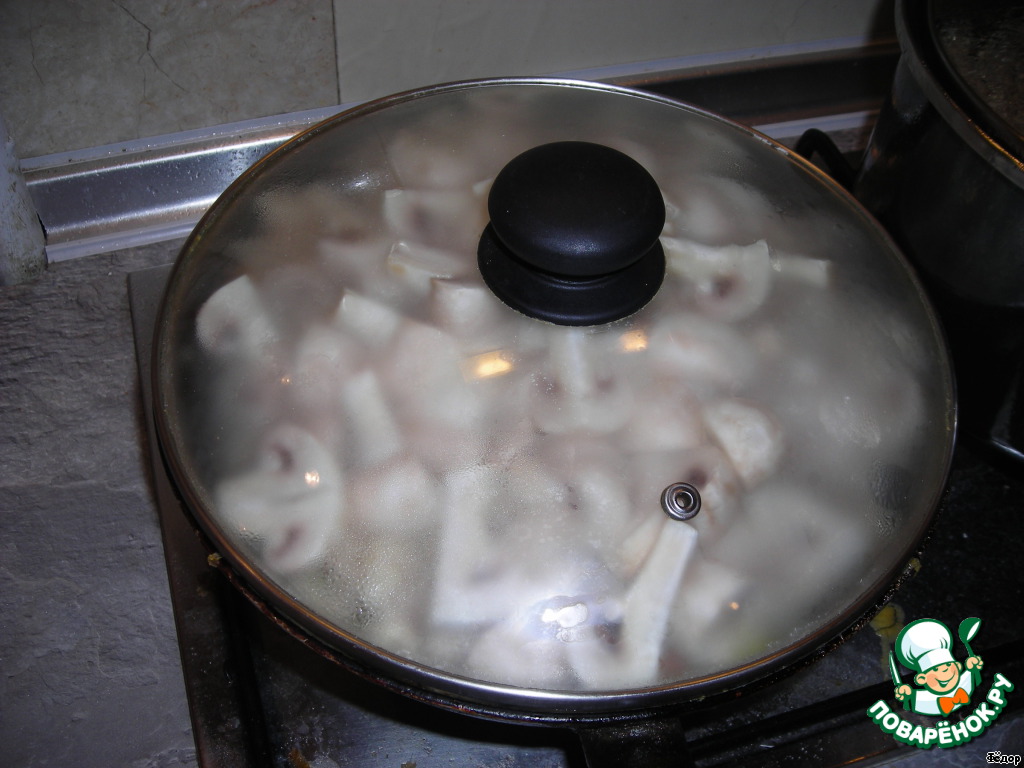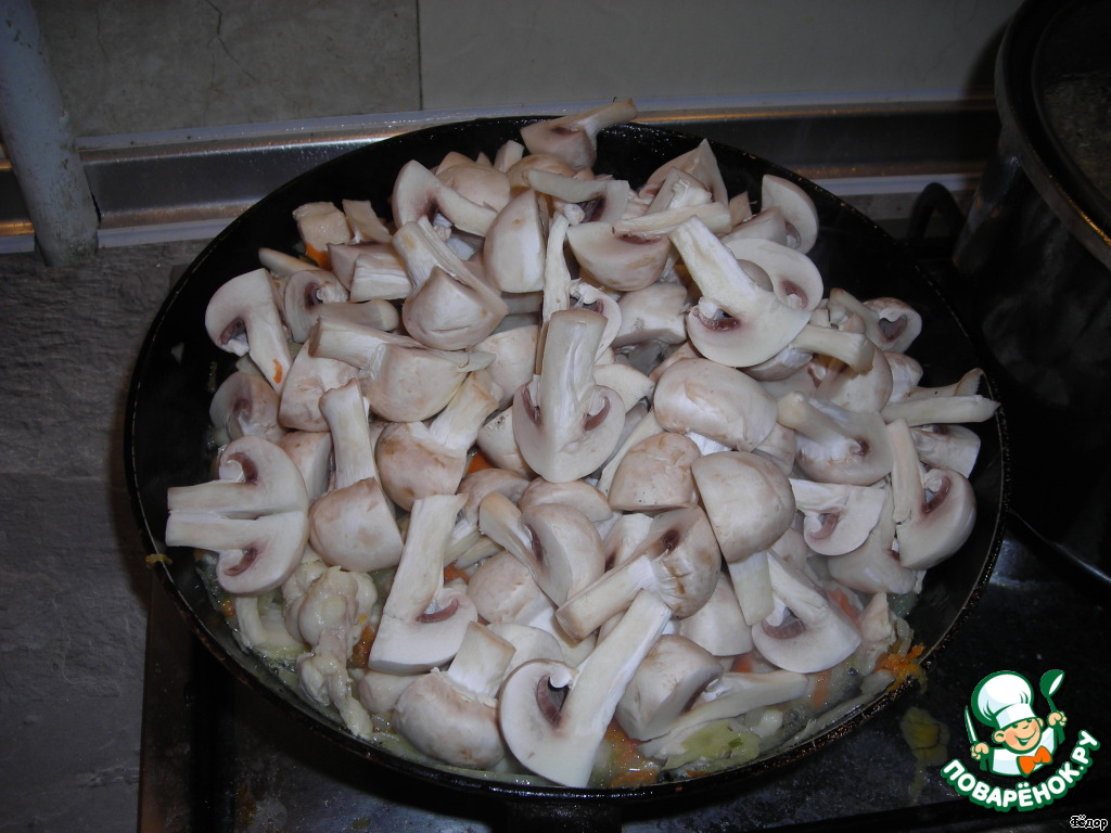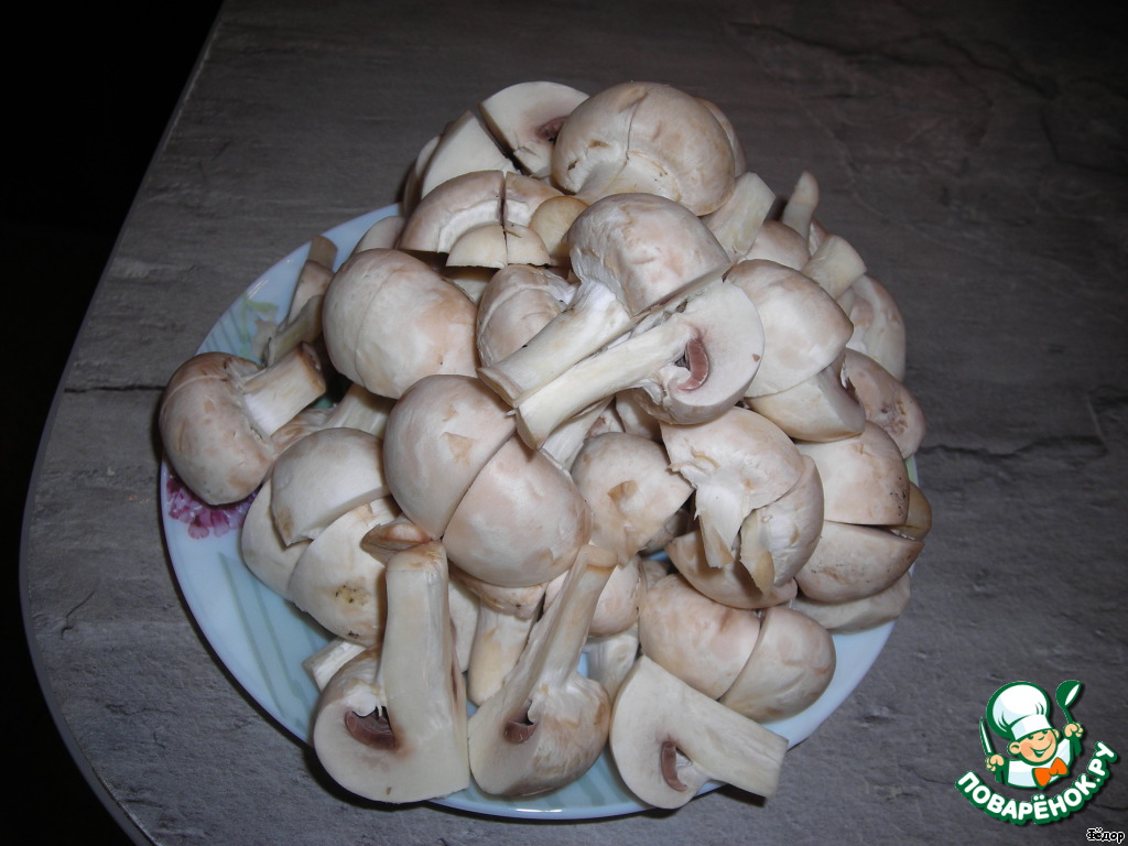 Режем грибы не очень мелко, в 3 раза крупнее, чем мясо.