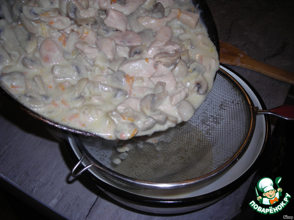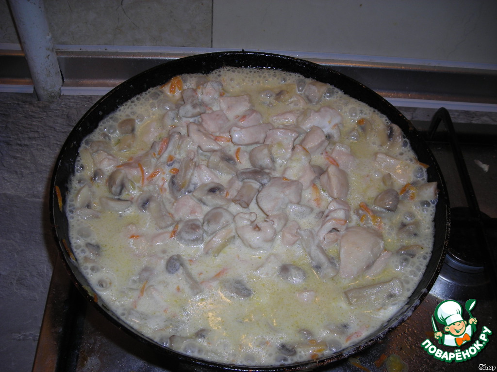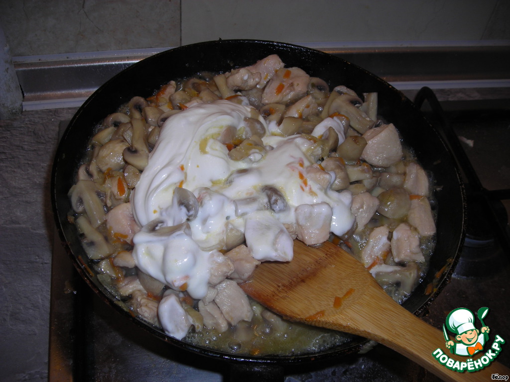 Добавить сметану, перемешать и уменьшить газ на средний огонь.