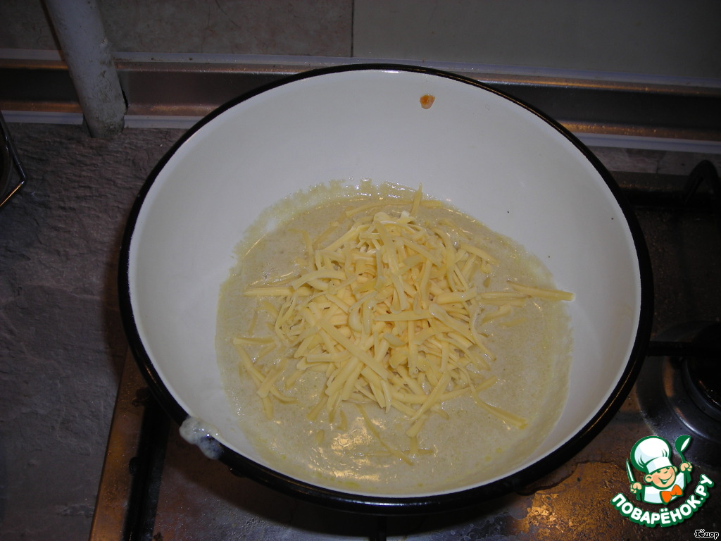 Добавить сушеный базилик, соль, перец, щепотку сахара и тертый сыр. Постоянно помешивать. После растворения сыра смесь вылить обратно в сковороду.