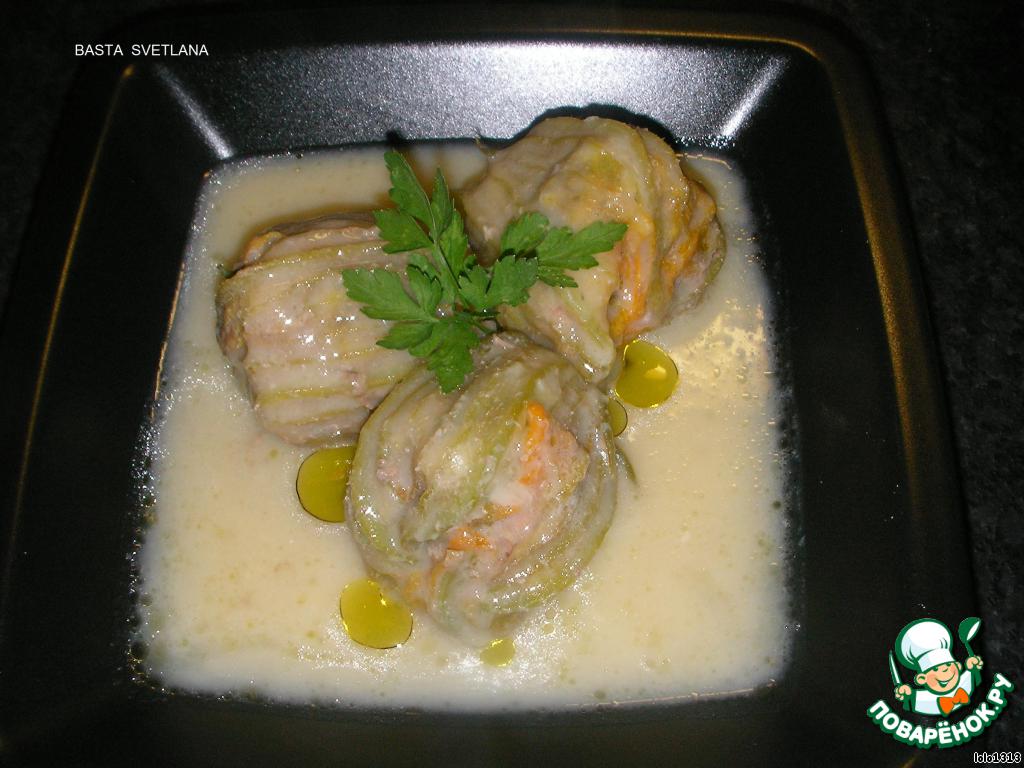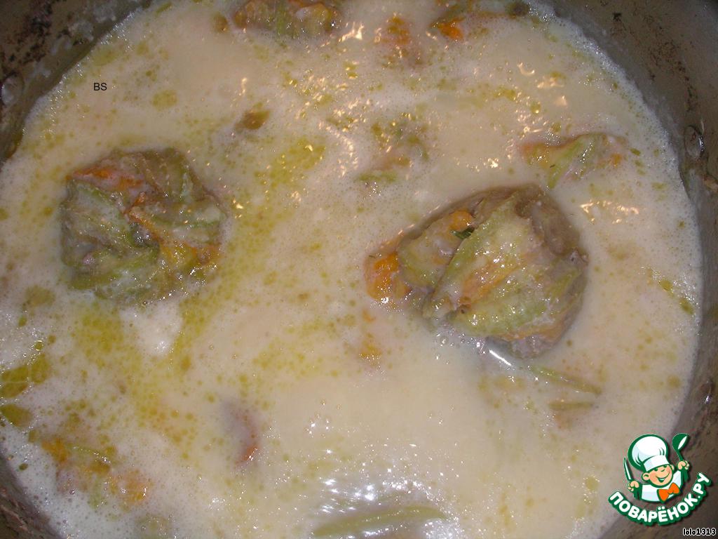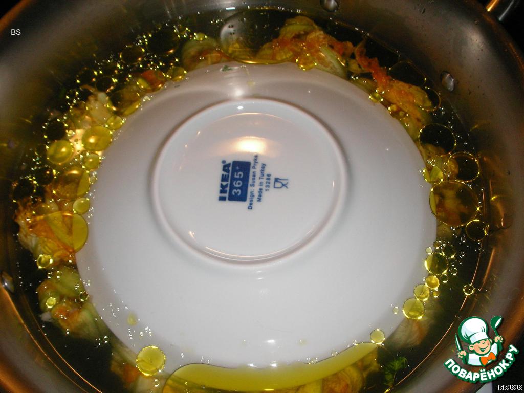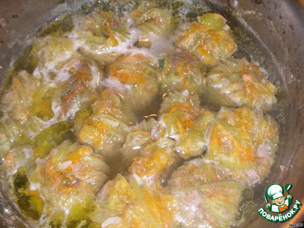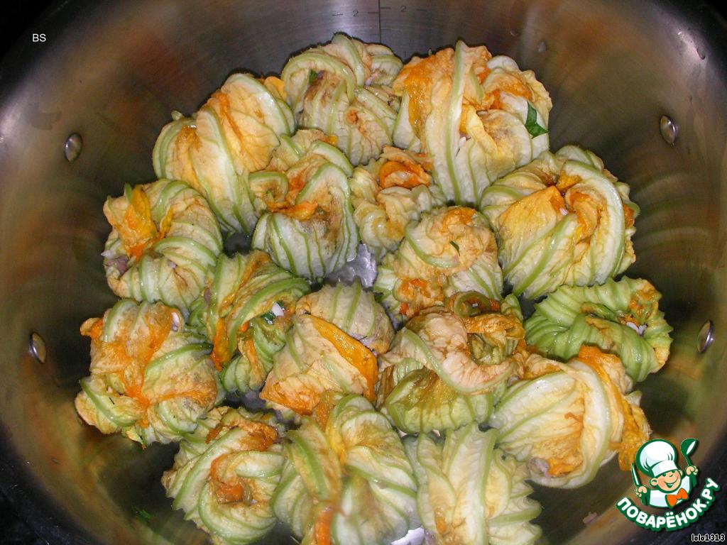 Начинить цветочки (пестики не удаляются, их тоже принимают в пищу) и уложить в кастрюлю.