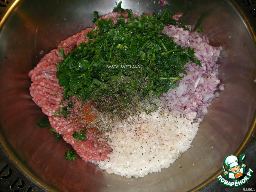 Подготовить фарш из мяса, риса, мелко нарезанного лука, зелени. Посолить, поперчить. Я добавляю немного воду, чтобы мясо было нежнее, и добавляю немного оливкового масла в сам фарш.