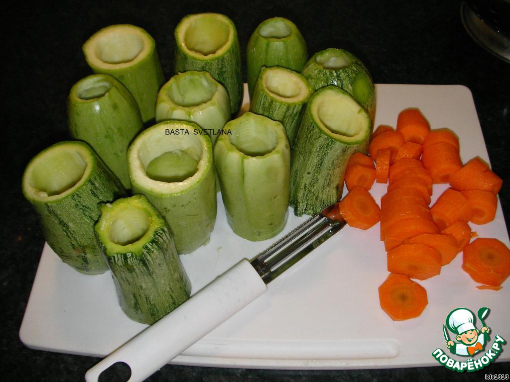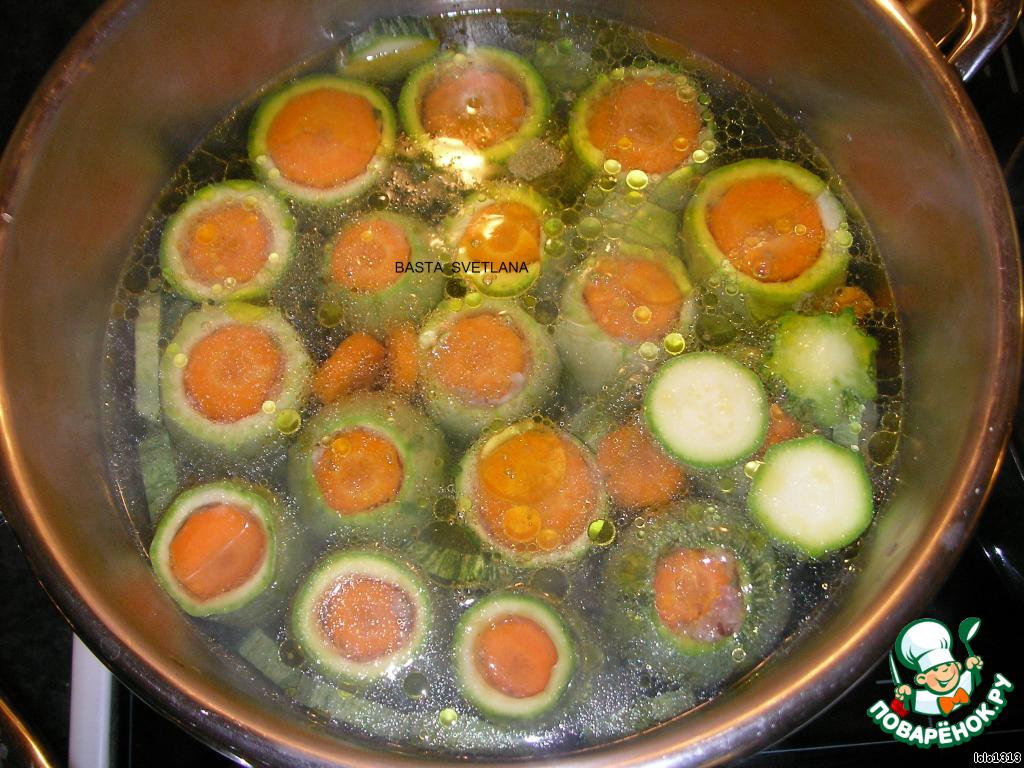 Весь процесс повторяется, только цветочки заменяются на кабачки. У меня кабачки среднего размера, но я их поделила пополам, удалила сердцевину - получился полый цилиндр. Таким образом можно выложить их в кастрюлю "стоя" очень плотно и никакой тарелкой прикрывать кабачки не придётся!, чтобы они находились в жидкости (и не всплывали).