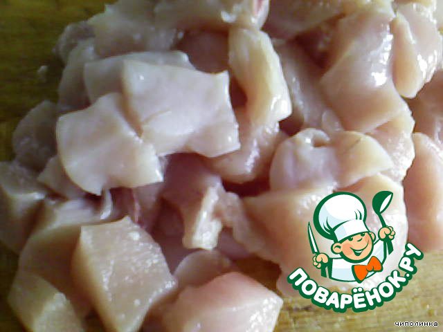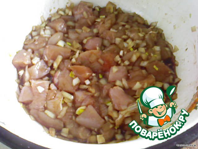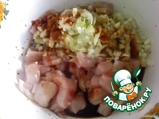 В нарезанное филе добавить лук, поперчить, посолить по вкусу, добавить соевый соус, лимонный сок.