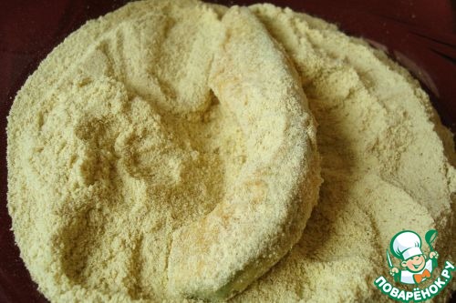 Сначала мы приготовим три тарелочки. Первую с подсолёной мукой. Вторую со взбитыми яйцами и третью с панировочными сухарями.