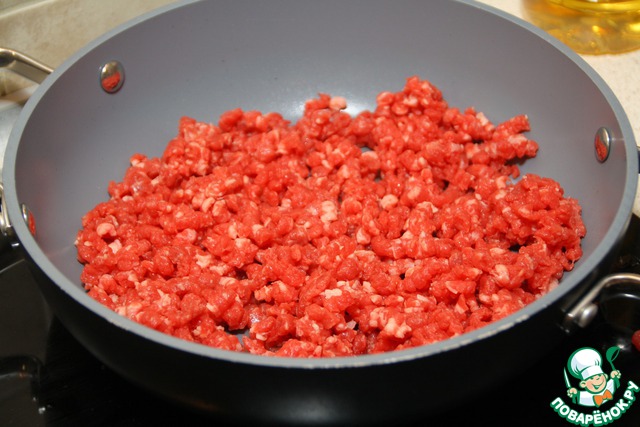 Обжарить на кунжутном масле говяжий фарш в течение 10 минут (помешивая).