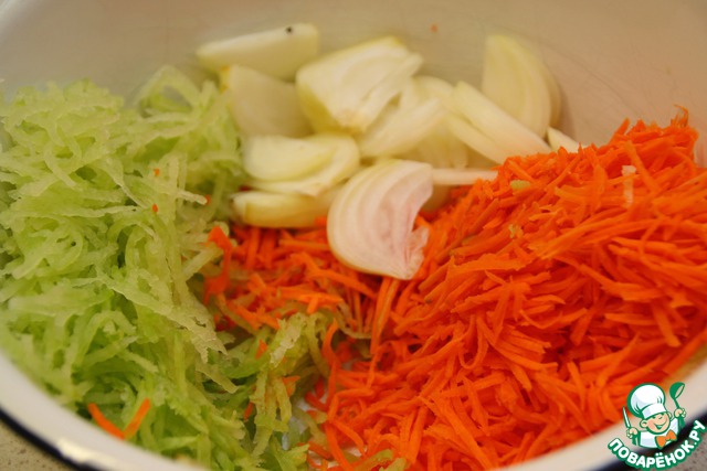 Пока жарится фарш, нарезать лук дольками, морковь и редьку натереть на специальной терке для приготовления моркови по-корейски. Если таковой не имеется - крупно натереть.