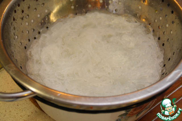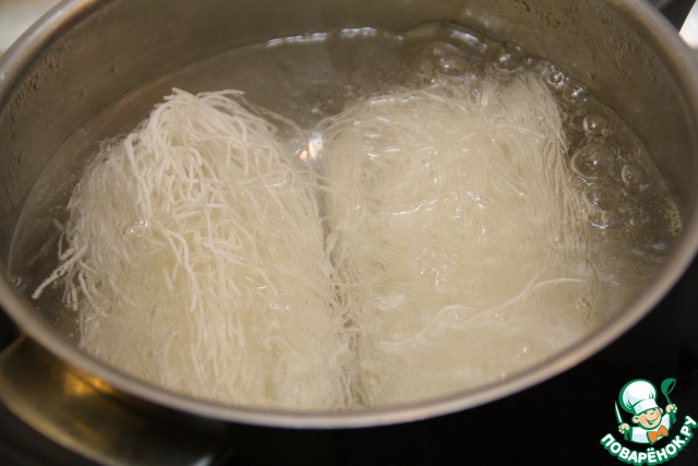 Поставить вариться фунчозу (положить в кипящую воду и варить 5-7 минут).