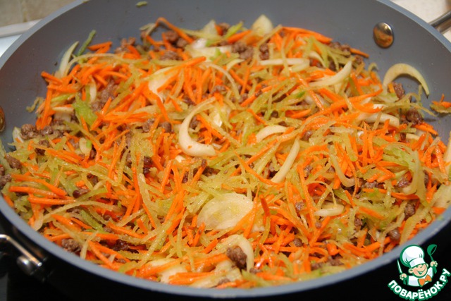 В конце жарки добавить к овощам и фаршу чеснок (пропустить через чеснокодавку).