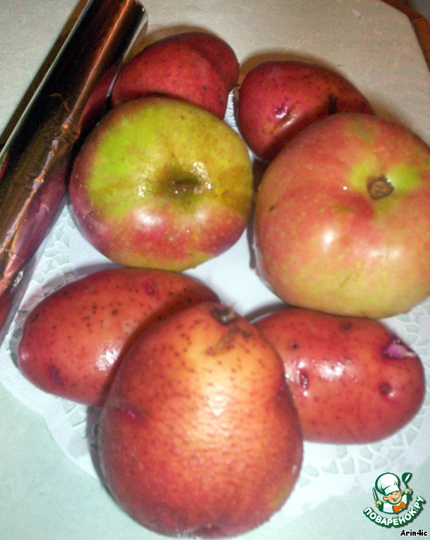 Испечь в "в мундирах" картофель и яблоки, завернув каждый плод в фольгу или пергамент. Очистить запеченные овощи и фрукты от кожуры и протереть через сито в пюре.