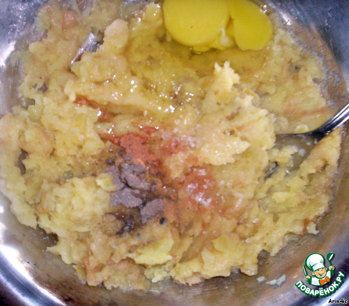 В пюре добавьте яйцо, муку, специи, соль и измельченный чеснок. Хорошенько перемешайте.