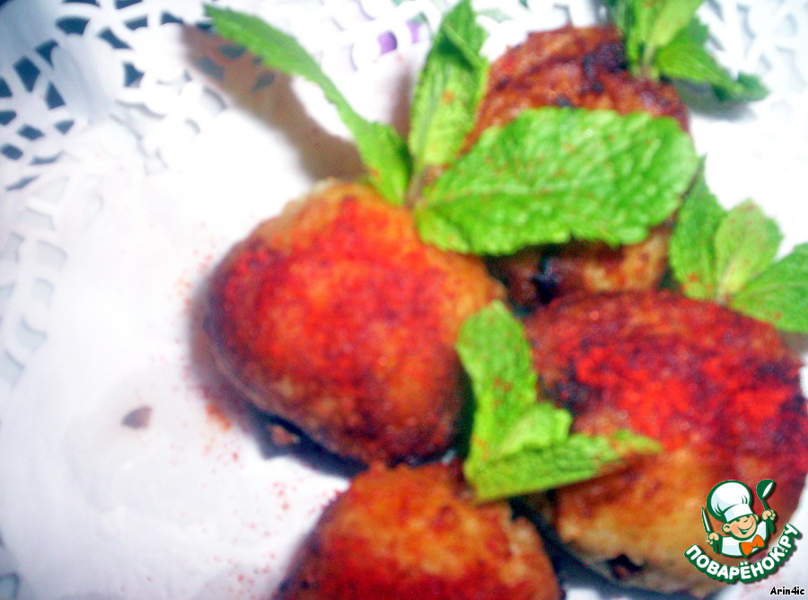 Приготовьте фритюр (автор предлагает смешать растительное и топленое масло пополам), я жарила в растительном масле. Чтобы масло не горело, можно опустить ломтик сырой картошки. Обжаренные картофельные шарики выложите на бумажное полотенце, чтобы избавиться от лишнего жира. Украсьте "яблочки" листиками мяты, гвоздичкой и посыпьте один "бочок" красной паприкой.