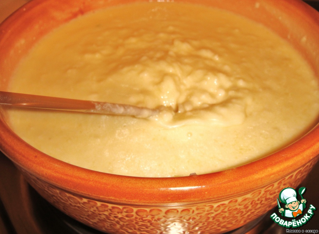 3. Если же фондю расслаивается и никак не желает превращаться в однородную массу, то разводим немного кукурузной муки в небольшом количестве вина или шампанского, добавляем капельку лимонного сока, вливаем эту смесь в фондю. Переносим горшочек на горячую плиту и снова доводим до кипения, основательно перемешивая.