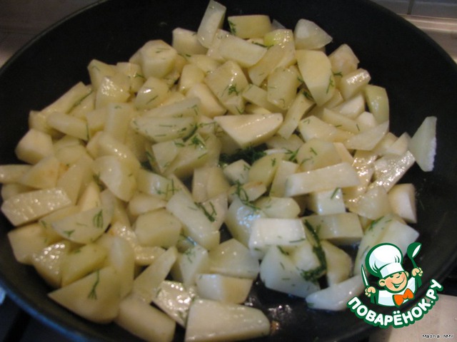Обжариваем на растительном масле до появления золотистой корочки, солим, добавляем немного укропа, укладываем в форму для запекания (у меня - кастрюлька из плотного стекла)