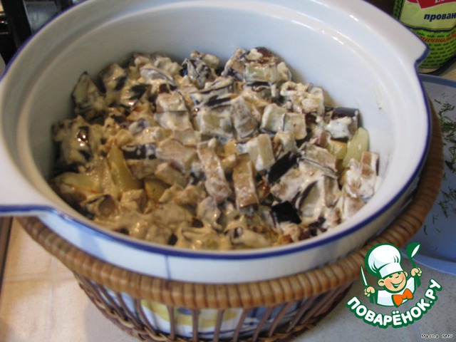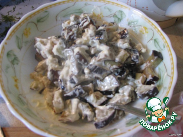 Перемешиваем баклажаны с чесночным майонезом (в 3-4 столовых ложки майонеза выдавить 3 зуб. чеснока).