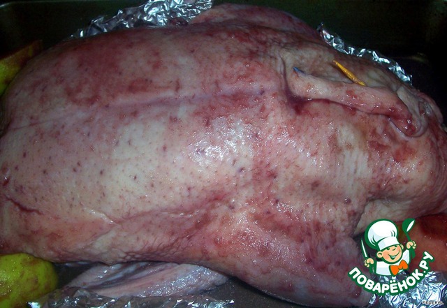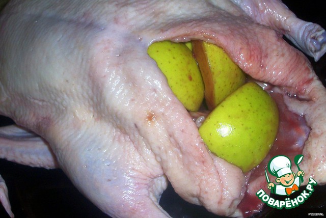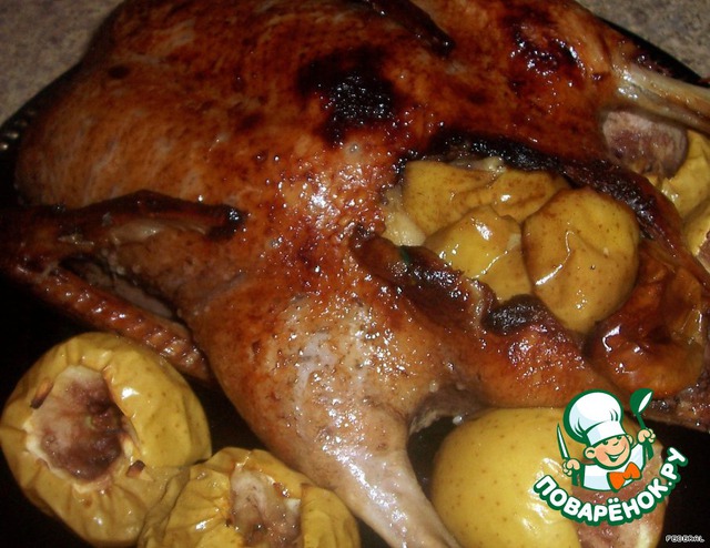 # Утку вымыть, обсушить, при необходимости опалить, кожу натереть солью, внутрь поместить яблочную начинку. Разрез скрепить деревянными шпажками.