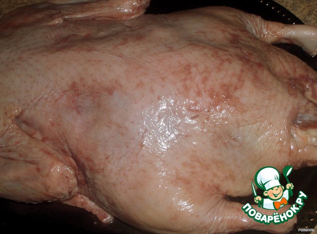 Уложить птицу на противень грудкой вверх, налить на противень 50 мл воды. Поместить в разогретую до 200°С духовку на 1,5 ч.