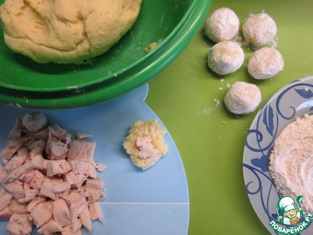 Отделяя порционные кусочки от картофельного теста, сформировать пончики, пряча в серединку сюрприз - кусочки куриного филе.