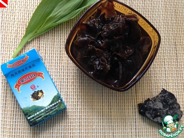 Китайские грибы заливаем кипятком, ждем, пока они приобретут свой изначальный вид. Я специально сфотографировала как выглядит пачка грибов (тех, что продаются у нас) - она размером со спичечный коробок, и как выглядит ее содержимое. В одном из моих предыдущих рецептов я тоже их использовала и было много вопросов, как они выглядят.