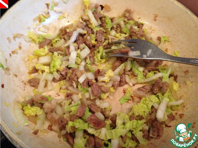 На растительном масле обжариваем свинину и мелко нарезанный лук и спустя минут 5 добавляем капусту.