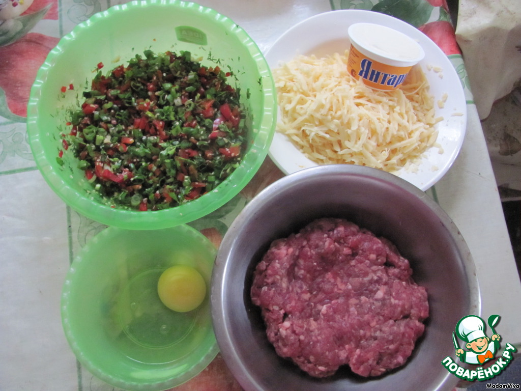 Пока картофель варится, подготавливаем другие ингредиенты. Взбиваем яйцо; мелко режем зелень и болгарский перец; натираем сыр на крупной терке; в фарш добавляем специи