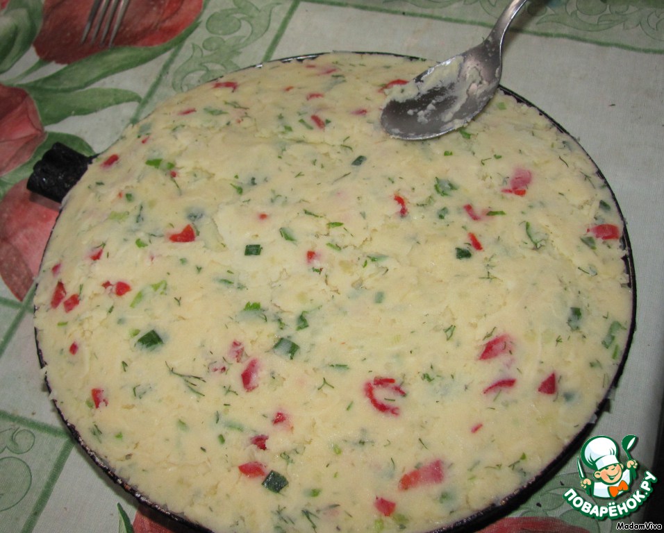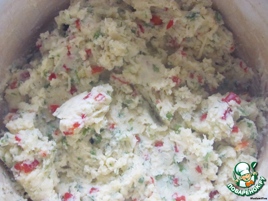 Сваренный картофель разминаем, добавляем сливочное масло, плавленый сыр, яйцо, натертый сыр, смесь из зелени и болгарского перца. Все тщательно перемешиваем.