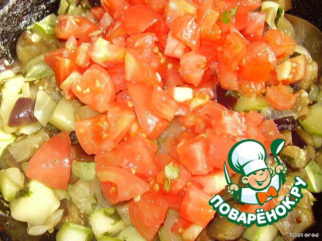 Затем добавить помидоры, очищенные от шкурки и нарезанные кубиками.