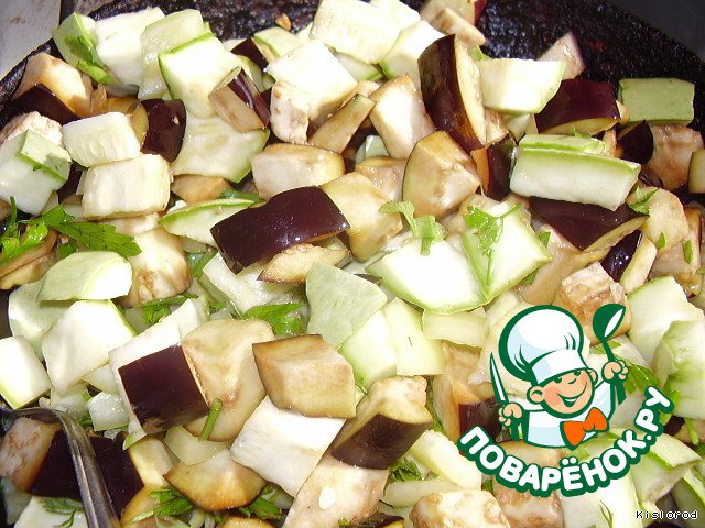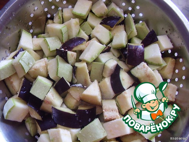 Кабачки и баклажаны нарезать кубиками среднего размера, посолить, перемешать.