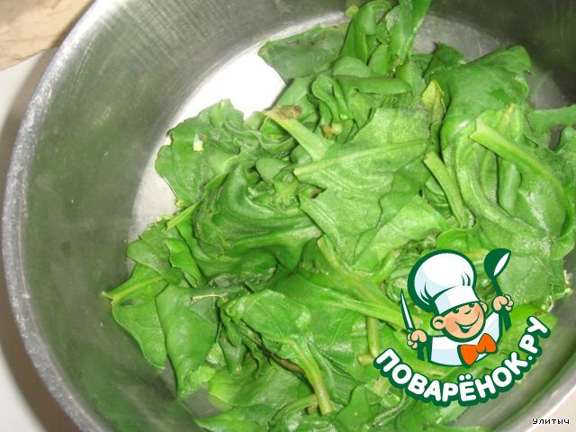 Помытый шпинат ошпариваем кипятком и тоже ждем пока стечет.