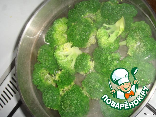 В подсоленной воде отвариваем брокколи,5 мин не больше,отбрасываем стекать на дуршлаг.