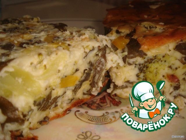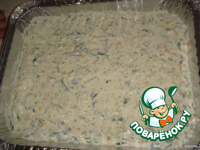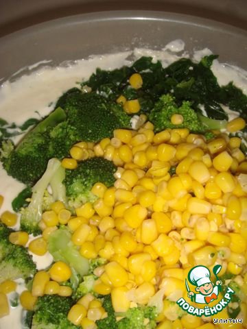 Сырная запеканка со шпинатом, брокколи и консервированной кукурузой
