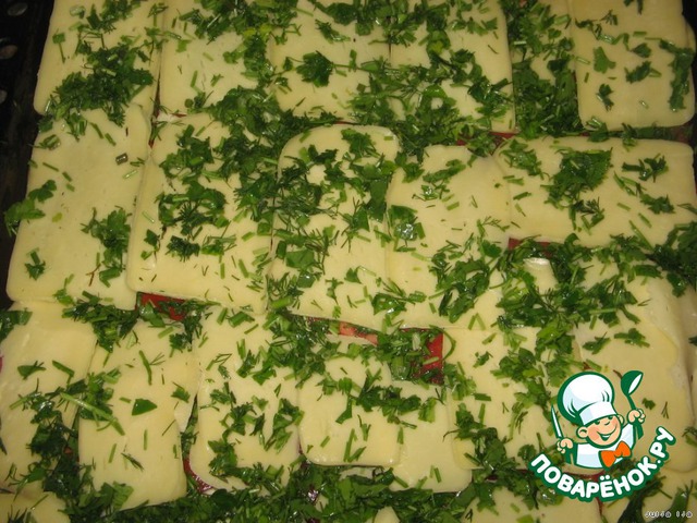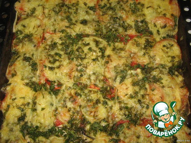 Ещё раз посыпаем зеленью и отправляем в духовку, разогретую до 200°С, минут на 30.