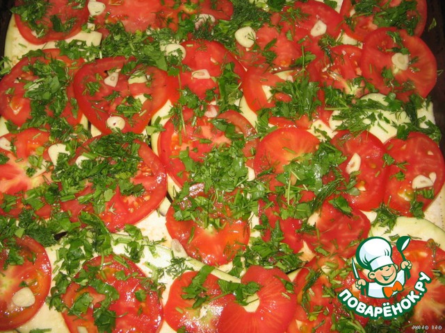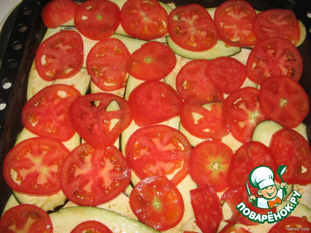 На баклажаны укладываем нарезанные кружочками помидоры.