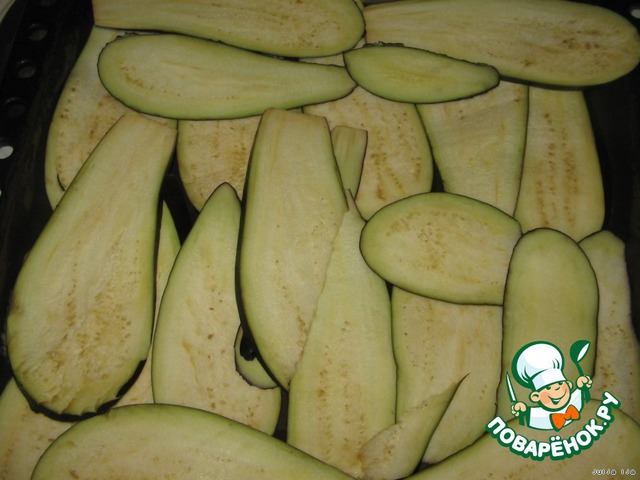 Нарезаем баклажаны вдоль тонкими ломтиками, укладываем их на противень, слегка солим (количество соли в этом рецепте зависит от того, насколько солёным будет сулугуни).