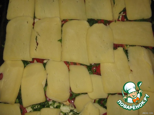 Сверху накрываем всё сыром. Я сулугуни не тру на тёрке, а режу тонкими пластинками.