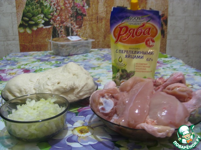 Это наши ингредиенты :готовое пирожковое тесто (можете сделать сами, я сама не вожусь), порезанная на кусочки курица (можно окорочка или грудку), мелко порезанный репчатый лук, майонез