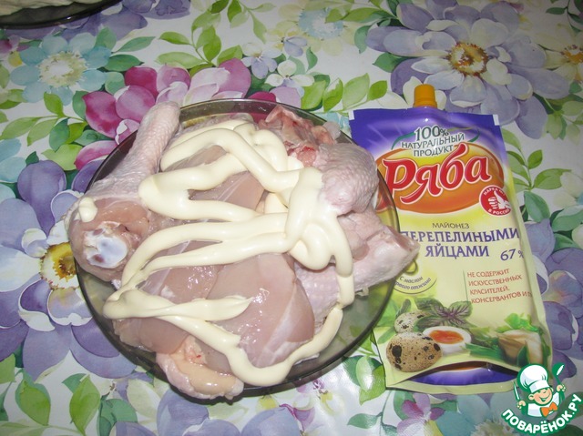 К курице добавляем майонез (и все что любите сами:чеснок, карри, перчик, аджику и т. д)перемешиваем с курицей. отставляем на 5 минут в сторону.