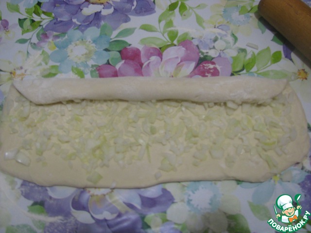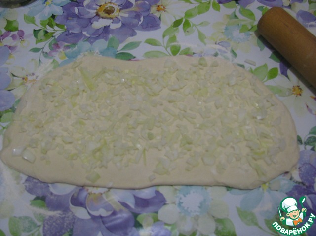 Эту колбаску раскатываем в овал, толщиной примерно 1-2 см. Сверху равномерно рассыпаем половину накрошенного лука.