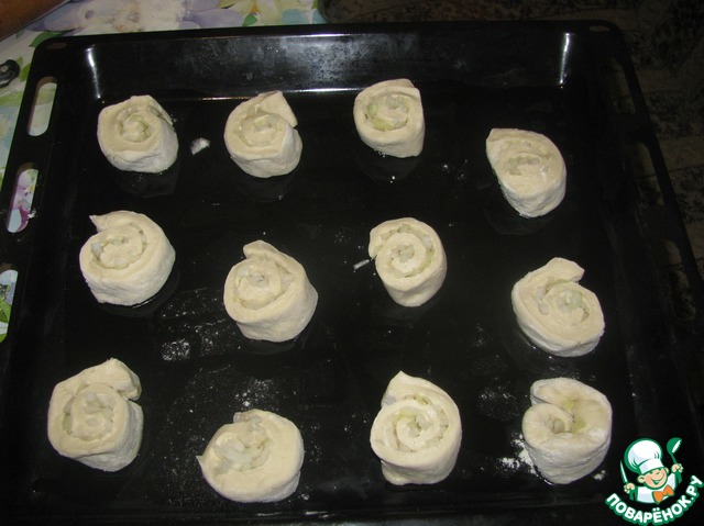 Выкладываем булочки на смазанный маслом лист, срезом вниз, в шахматном порядке.