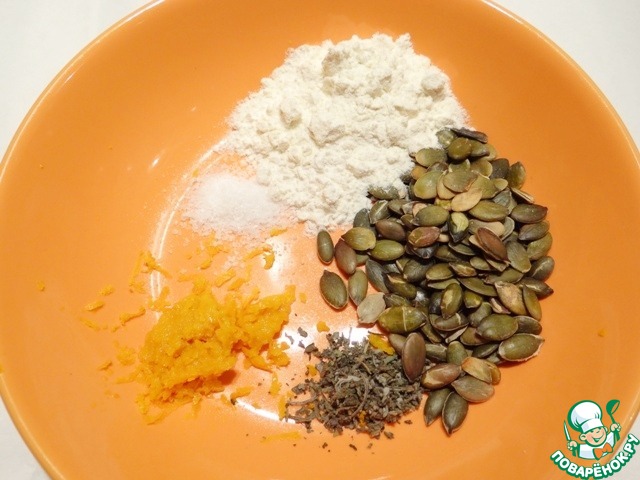 Соединяю муку, цедру апельсина, семечки тыквы, соль, шалфей.