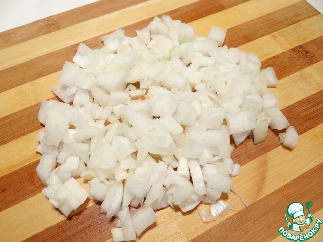 Теперь приступаю к приготовлению ризотто. Репчатый лук чищу, мою и нарезаю мелко на кубики.