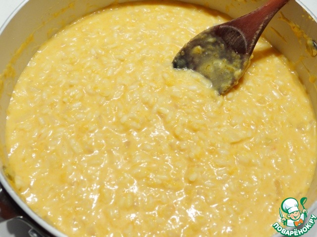 Перед добавлением последней порции бульона к рису добавляю мякоть тыквы, перемешиваю, готовлю ризотто дальше. Рис не должен перевариться, а быть чуть твердоватым в середине.